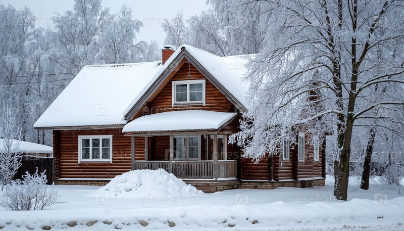 Снежная зимняя сцена с загородным домом, покрытым снегом