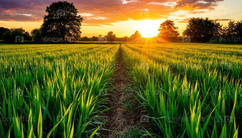 Золотой час света зажигательный зеленый урожай поле пышные растения Закат солнца светит