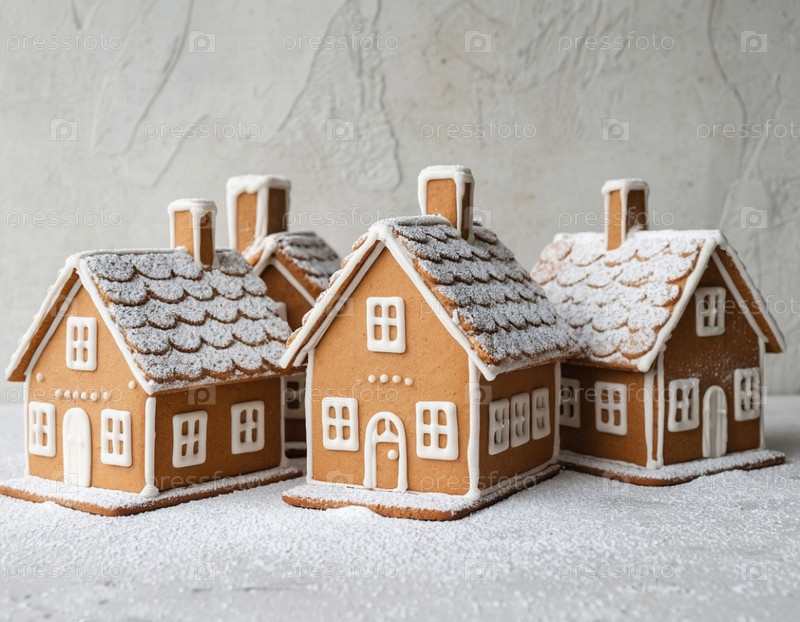 Имбирный хлеб съедобные дома на белом столе красочные страницы Sweet Christmas Bakery Scene with Decor