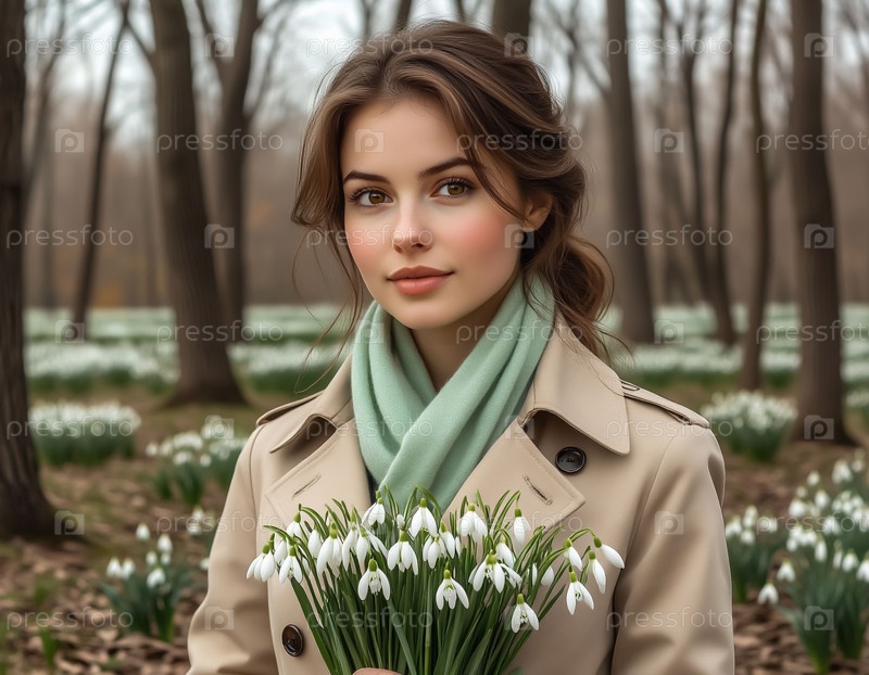 Молодая женщина в пальто с букетом снежинки на природе Сцена весны