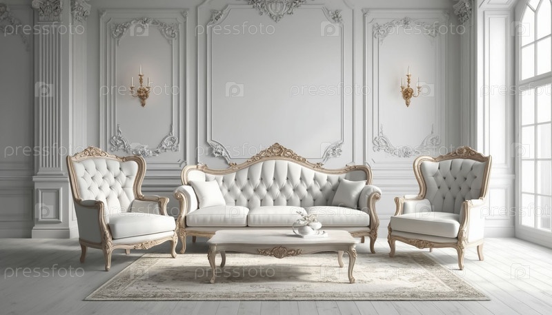 Роскошный белый интерьер гостиной с диванами в стиле барокко