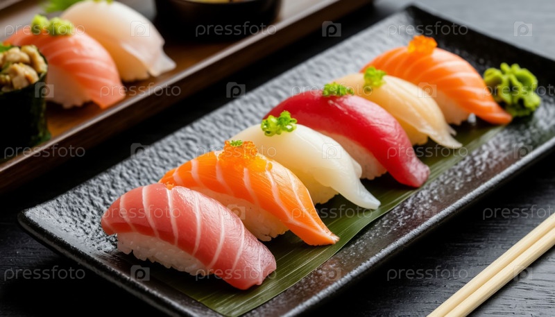 Традиционная японская кухня Суши-планшет на керамической тарелке с палочками для еды на минималистическом столе
