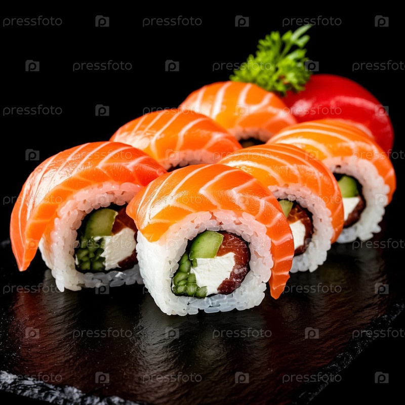 Изящные кусочки японских суши с начинкой из красной рыбы, изолированные на черном фоне