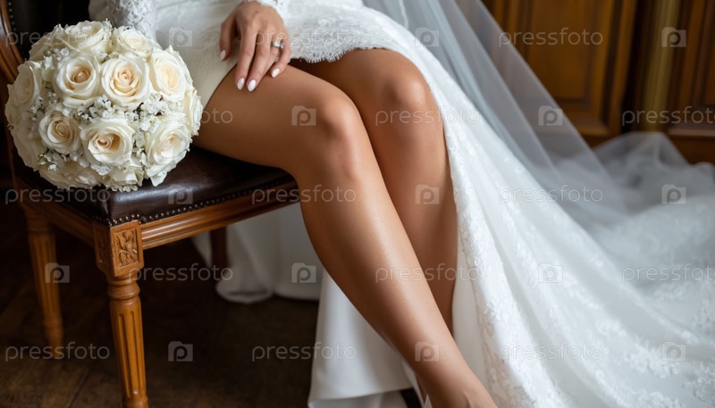 Ноги невесты подглядывают из-под свадебного платья до колен
