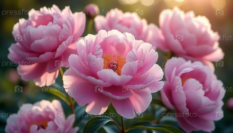 Закрыть деликатные розовые пионы с нежным утренним фоновым освещением светящихся лепестков