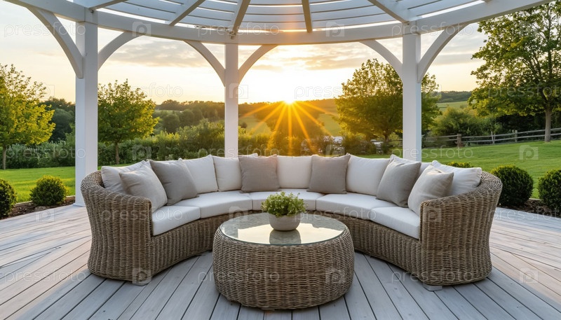 Уютный полукруглый диван из ротана с белыми подушками на минималистической белой террасе летом вечером, искусственное искусство