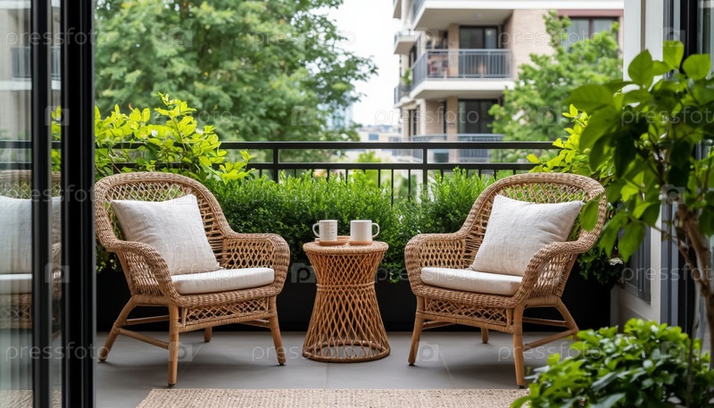 Летняя терраса с виковыми стульями Зеленые растения Уютная зона отдыха Внешнее пространство