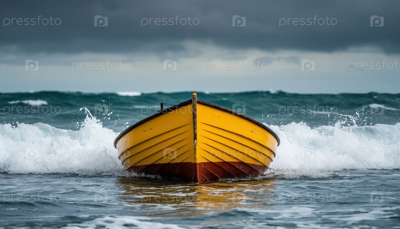 Одинокая желтая лодка вымыта на берег штормом в бурном море Драматическая пляжная сцена