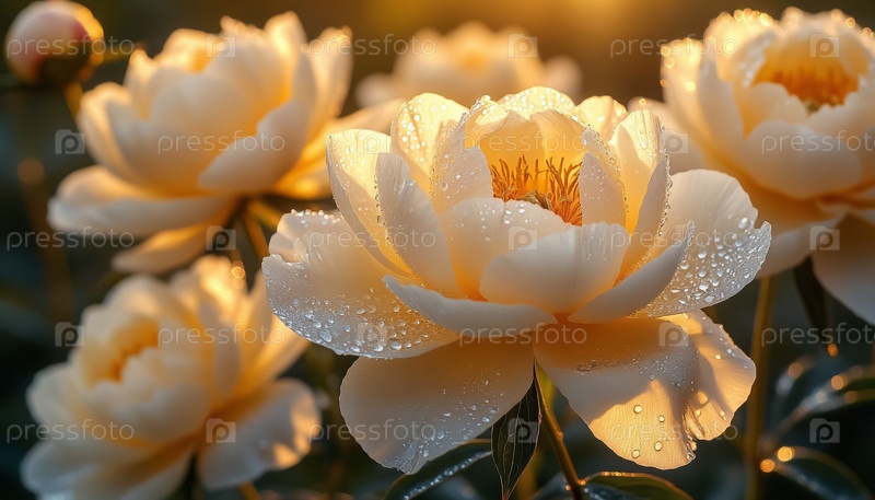Белые пионики с капельками росы, освещенные на заднем плане Утренний свет Прозрачные листья Природы Close Up
