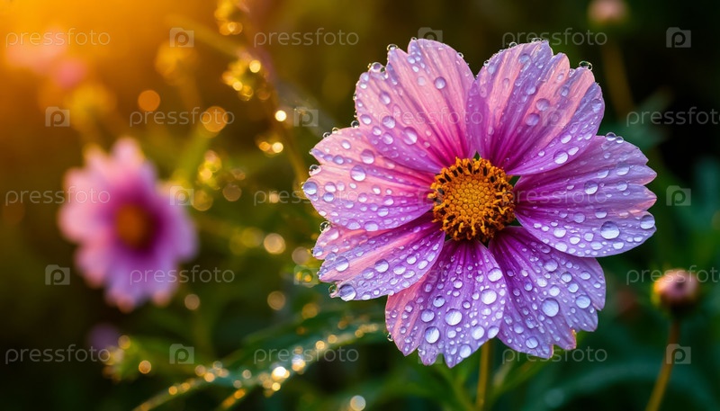 Садовые цветы с утренними капельками росы Мягкий солнечный свет и нежное сияние рассвета