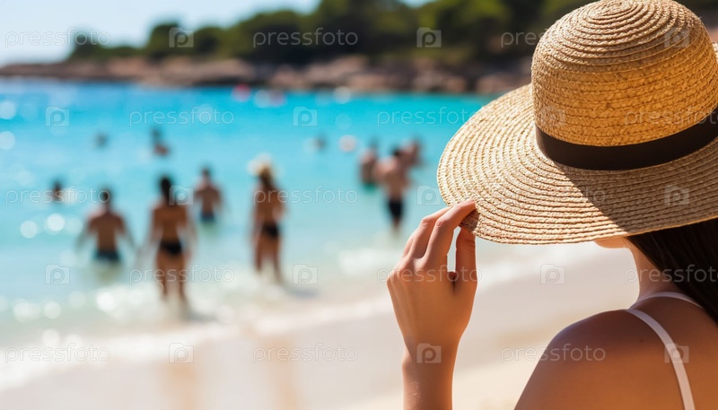 Вид женщины в соломенной шляпе на песчаном пляже Close Back Up
