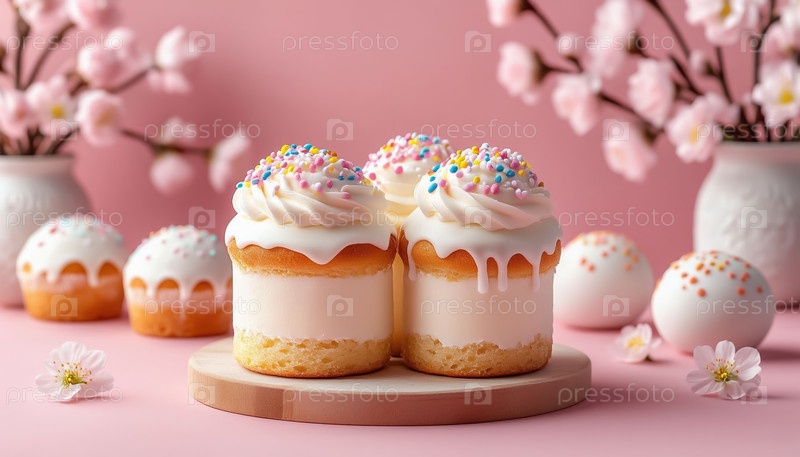 Традиционный пасхальный натюрморт с тортом Ивовая ветвь и яйца Пастельное розовое фоне