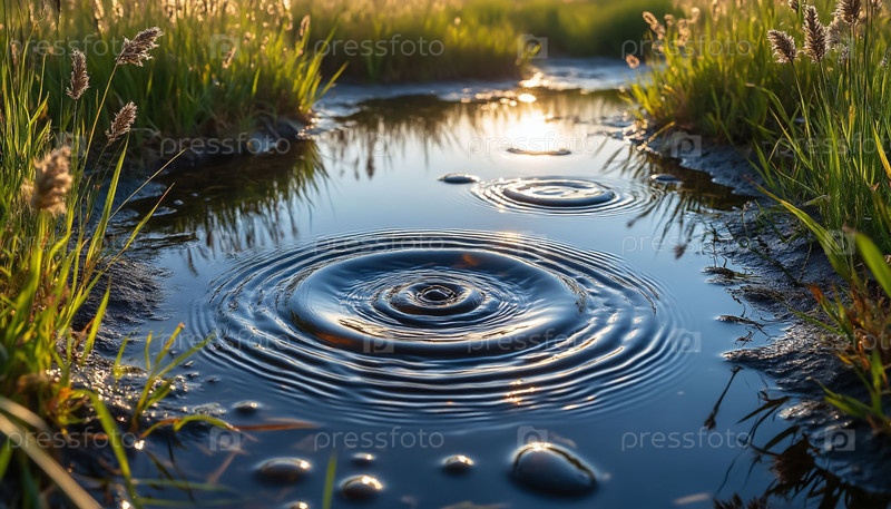 Близкий взгляд на водоем с падающим дождем, который создает круговые волны и отражает чистое голубое небо