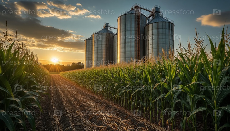 Зерновые силосы и пышное кукурузное поле на современной сельскохозяйственной сцене заката солнца