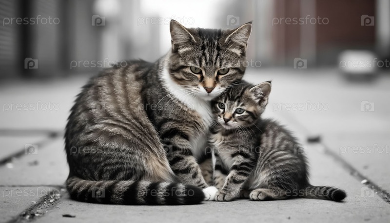 Одинокий бродячий кот и котенок на пустой улице в сумерках