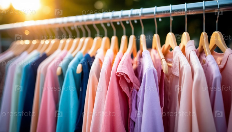 Летняя одежда на вешалки Модные покупки Сезонная распродажа Красочная экспозиция одежды