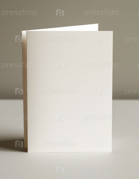 Белый пустой картонный макет для поздравительной карточки лежащий плоский на деревянной поверхности стола