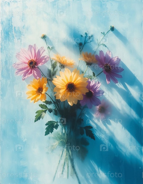 Красочное цифровое цветочное произведение искусства на мягком синем фоне Современная ботаническая иллюстрация