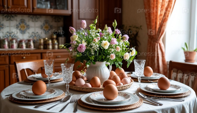 Красиво установленный праздничный стол с пасхальными декорациями Линейный художественный лист