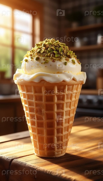 Кремная кружка мороженого, покрытая хрустящим фисташковым пирогом, ломается в хрупком конусе вафли