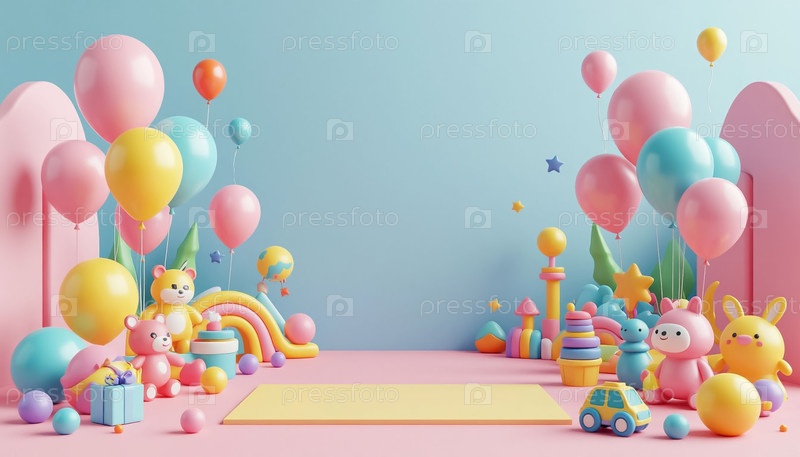 Детский приветственный фон с пустыми настенными воздушными шарами и игрушками Фотозона Баннер Мокап