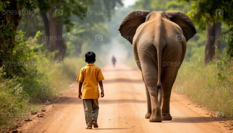 Молодой индуистский мальчик ходит с слоном на пыльной дороге традиционной индийской деревенской сцены