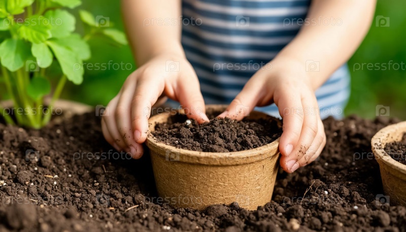 Закрытие детских рук Передача саженцев в торфяные горшки Весенняя деятельность