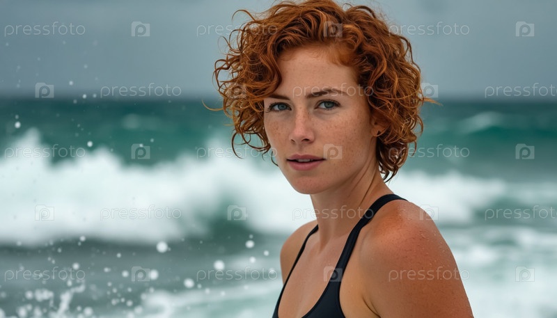 Красивая спортивная женщина в черном купальном костюме, стоящая на океанских волнах