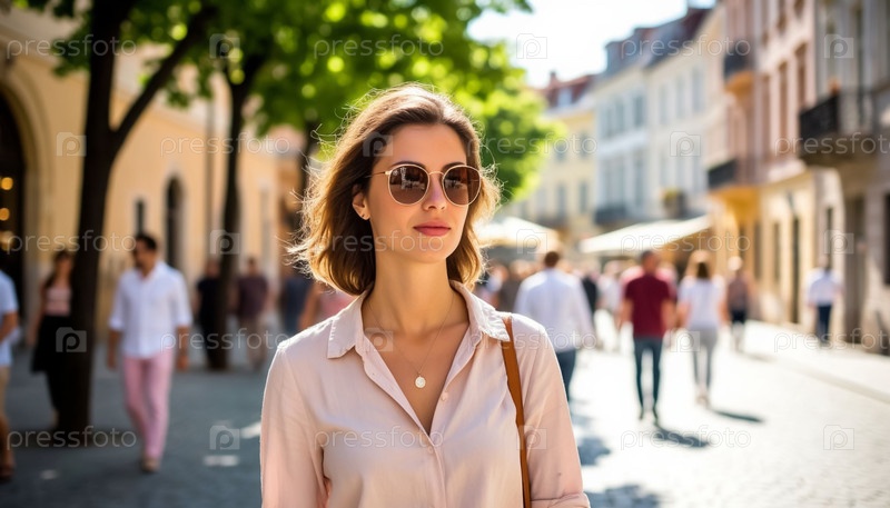 Туристка в розовой рубашке и очках исследует европейский город летом