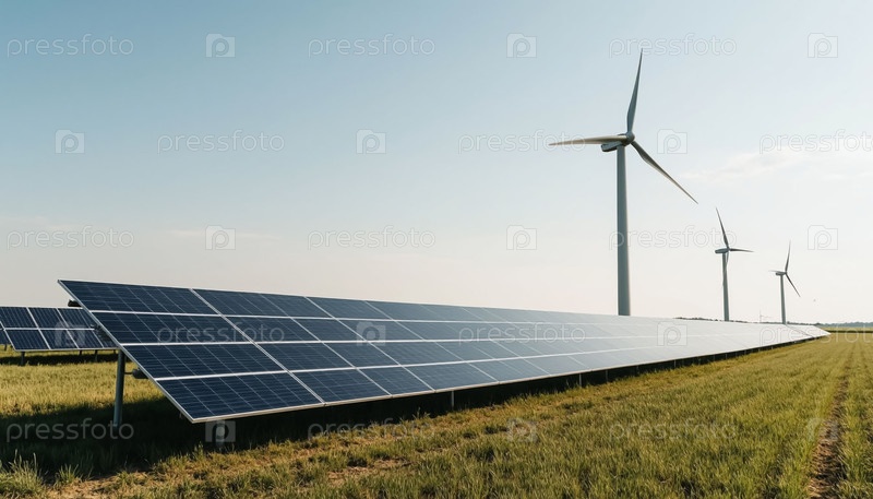 Солнечные панели и ветряные турбины в концепции экологически чистой возобновляемой энергии на новом месте