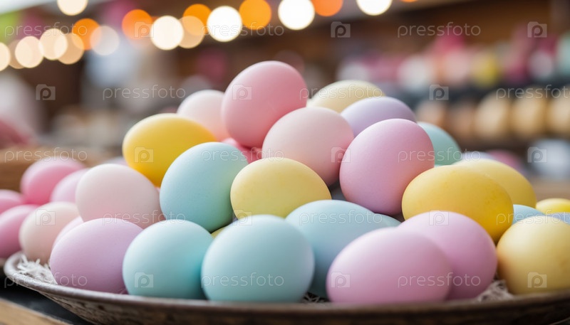 Пастельные пасхальные яйца на прилавке на праздничной ярмарке