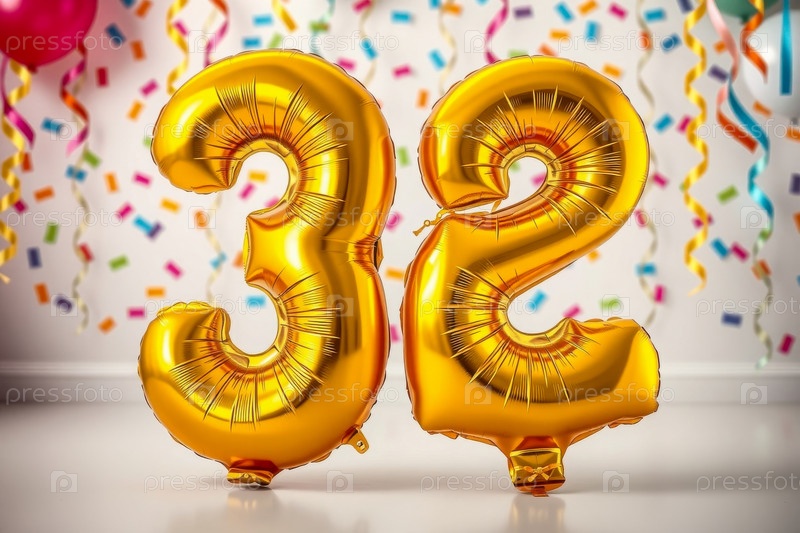 Гелий день рождения воздушный шар формы номер тридцать два, золотые буквы фигура 32 праздник праздничный фон декор