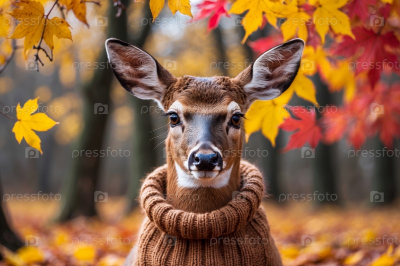 AI Generative Олень в трикотажном свитере на осеннем лесном фоне, животное с красными и желтыми листьями