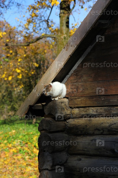 Кот сидит на выпуске верхнего венца старого сруба в осеннее время