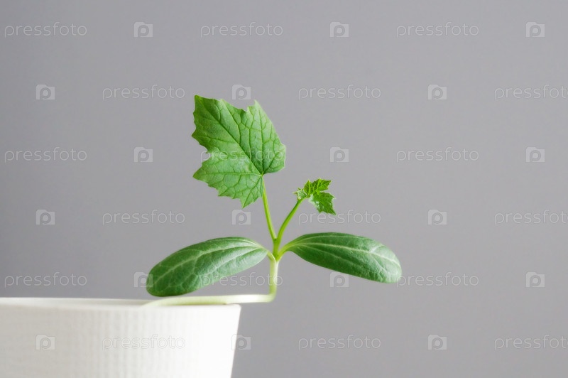 Молодой росток люффы в белом горшке — сеянец мочалки с зелеными листьями на сером фоне, выращивание рассады из семян
