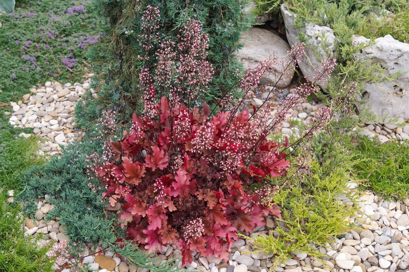 Гейхера с красными листьями в композиции с хвойными и камнями — декоративный многолетник в рокарии, ландшафтный дизайн сада