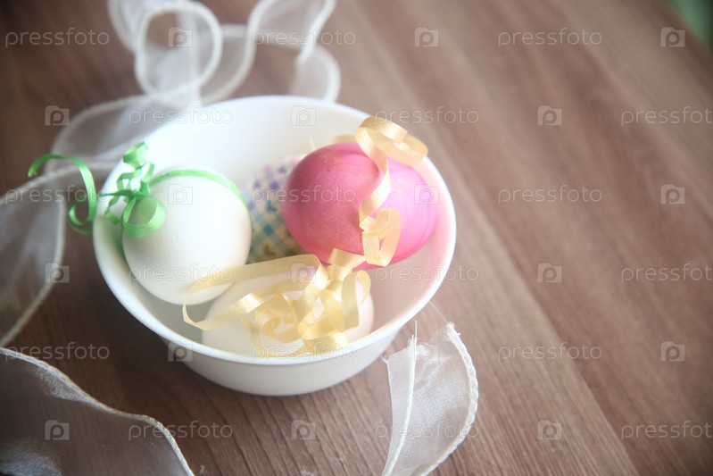 Яйца пасхальные с лентой на столе, крупный план. Празднование Пасхи