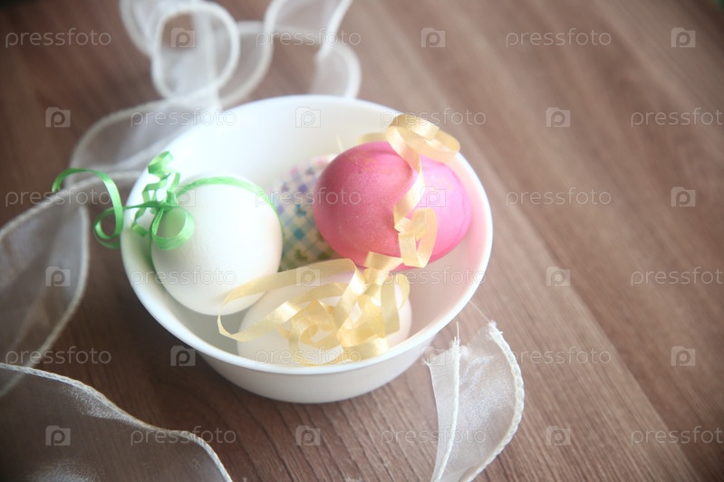 Яйца пасхальные с лентой, крупный план. Праздник Пасха