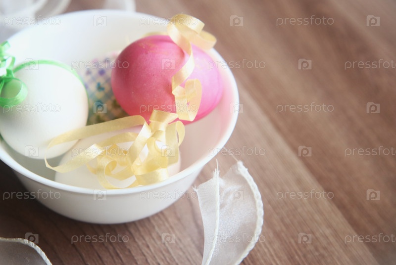Яйца пасхальные с лентой на столе, крупный план. Празднование Пасхи
