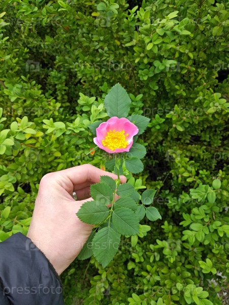 Прекрасный цветок шиповника в руке мужчины. Раскрывшийся бутон с нежными розовыми лепестками. Красота природы. Полезное лекарственное растение