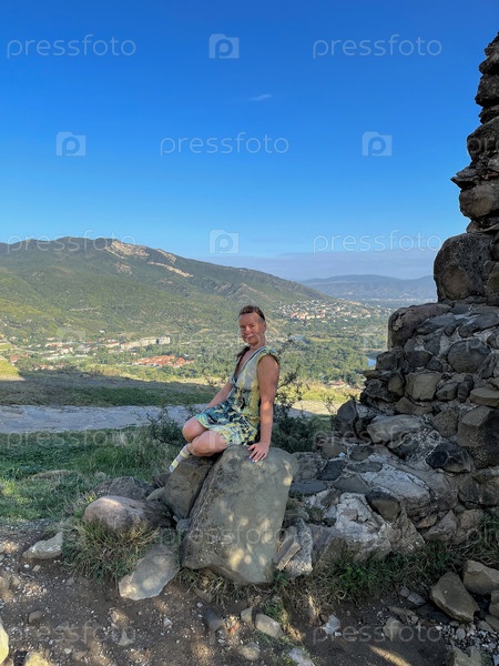 50-летняя женщина в красивой природе Грузии летом