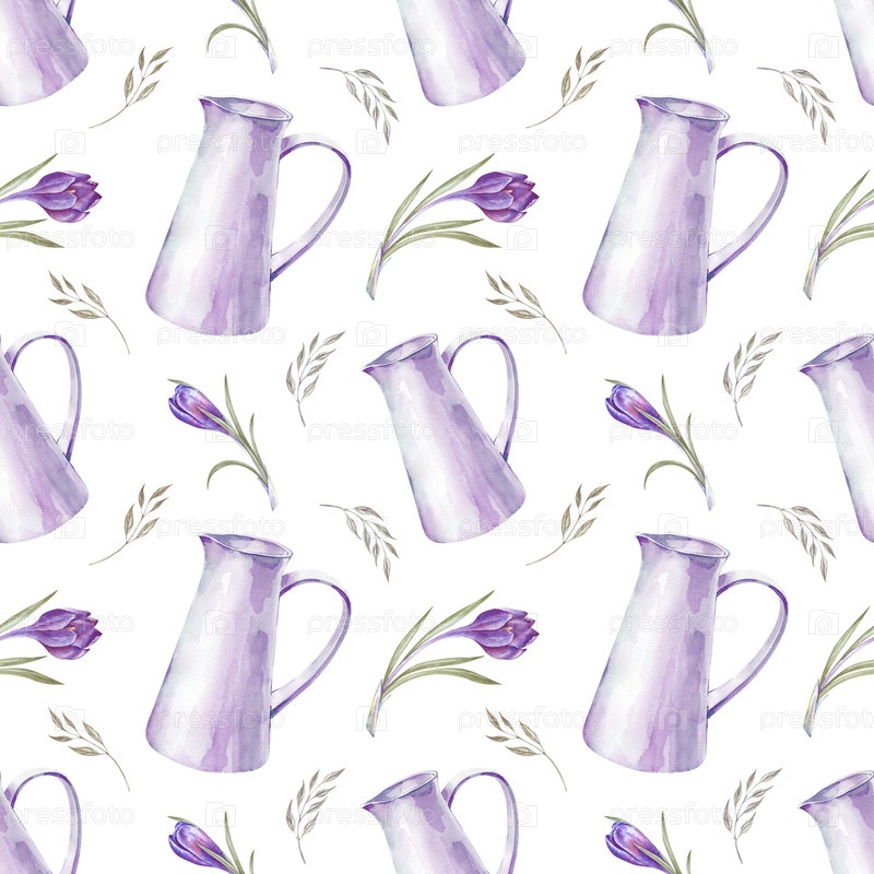 Бесшовный рисунок с белым кувшином, фиолетовыми крокусами и зелеными листьями. Акварельная весенняя иллюстрация на изолированном фоне. Реалистичный сезонный фон для дизайна пасхальных праздников, темы весны и садоводства