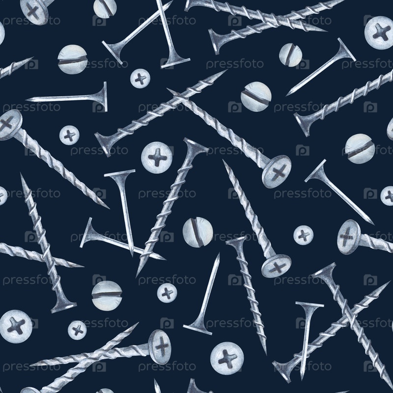 Бесшовный рисунок со шрубами, самозажимающимися и гвоздями на темном фоне. акварельная иллюстрация реалистичных рабочих инструментов для ремонта дома. фон для упаковки, обоев, оберточной бумаги