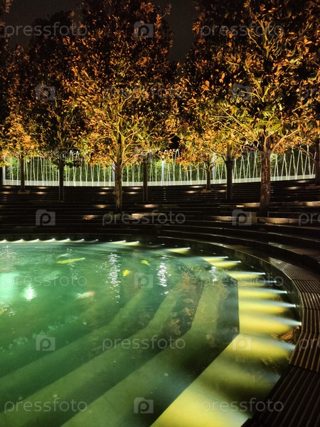 Завораживающий пруд Koi в современном парке ночью, освещенный ландшафтный фон, спокойные городские обои