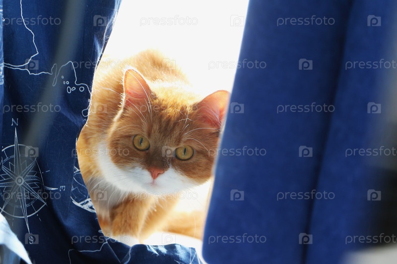 Любопытный оранжевый и белый кот заглядывает сквозь синюю ткань