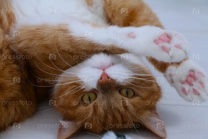 Очаровательный имбирный кот, лежащий на спине с розовыми бобами