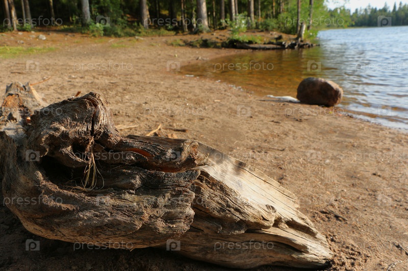 Дрифтвуд на берегу песчаного озера с лесом в фоне