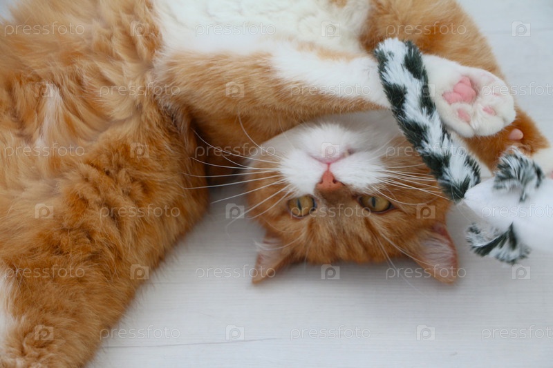 Милый рыже-белый кот наслаждается игрушкой, лежа на спине