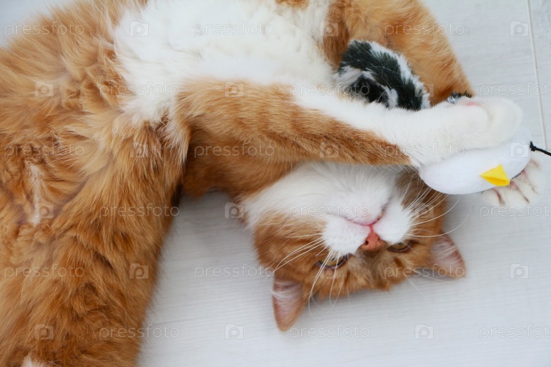 Милый рыже-белый кот наслаждается своей игрушечной мышкой, лежа на спине