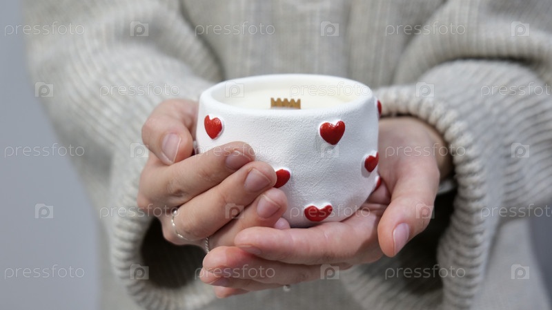 Ручная свеча из соевого воска с деревянным фитилем в белом гипсовом держателе, украшенном красными сердцами